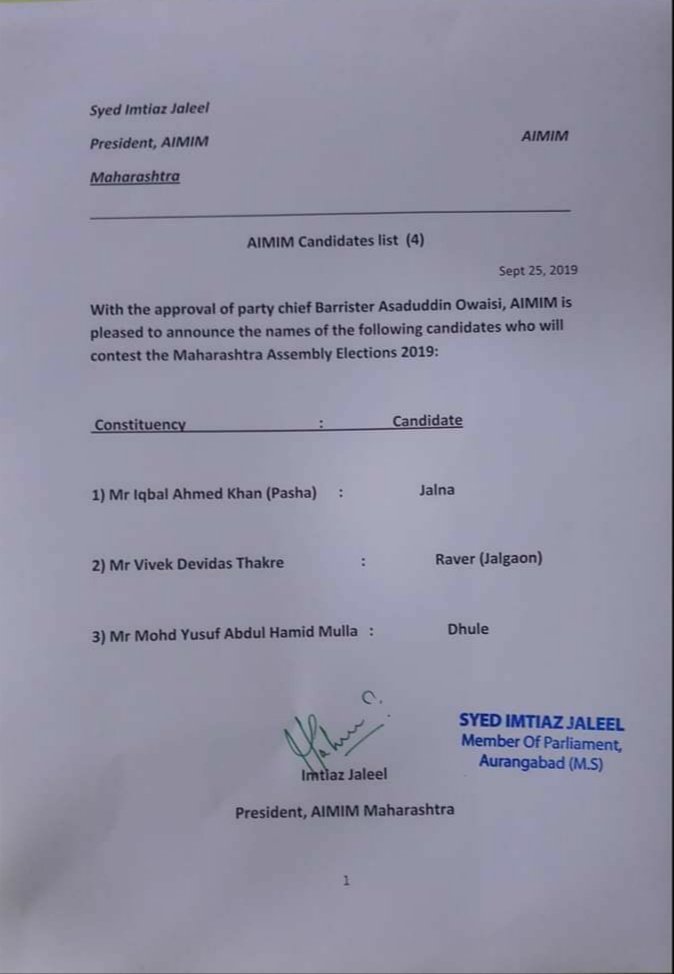 Aimim On Twitter Aimim National Is Pleased To Announce The 4th List Of Upcoming Maharashtraelections2019 Iqbal Ahmed Khan Pasha Jalna Vivek Devidas Thakre Raver Jalgaon Mohammed Yousuf Abdul Hamid Mulla - Aimim aurangabad mp candidate imtiyaz jaleel nomination grand rally yaha sirf majlis ke videos available hai.
